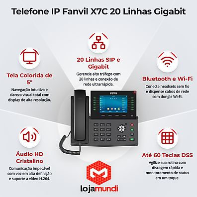 O Fanvil X7C oferece funcionalidades avançadas, como uma tela colorida de 5 polegadas, suporte para até 20 contas SIP, Bluetooth embutido e possibilidade de expor até 60 teclas DSS com LED. Essas características garantem facilidade de uso, personalização e uma experiência de comunicação eficiente.