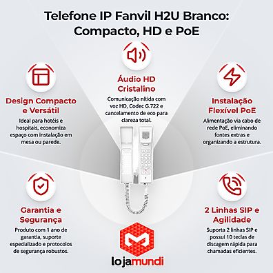 O Telefone IP Fanvil H2U Branco combina estilo sofisticado com desempenho superior, tornando suas comunicações corporativas mais eficientes e elegantes. Com um design compacto e moderno, este equipamento é ideal para ambientes onde o espaço e a estética são fundamentais. Equipado com recursos avançados de VoIP, o H2U oferece qualidade de áudio cristalina através de seu codec de banda larga, garantindo conversas claras e sem interrupções. Além disso, seu display digital facilita a navegação e a gestão de chamadas, contribuindo para uma experiência de uso mais intuitiva.