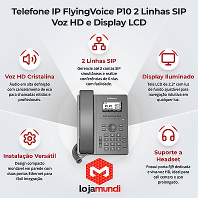 Projetado para ambientes corporativos modernos, o P10 FlyingVoice oferece recursos que otimizam o fluxo de trabalho, como o suporte a multiplas linhas e conferências, permitindo que as empresas lidem eficazmente com um alto volume de chamadas. Com uma interface amigável e fácil de usar, este telefone IP é ideal tanto para pequenos escritórios quanto para grandes call centers. A compatibilidade com os principais sistemas VoIP do mercado assegura uma integração perfeita em sua infraestrutura de comunicação.