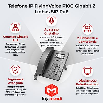 O Telefone IP P10G FlyingVoice não é apenas um aparelho; é um investimento na qualidade das suas operações diárias. Equipado com funcionalidades que otimizam o tempo e aprimoram a comunicação, ele se destaca em seu segmento, oferecendo segurança, praticidade e eficiência em um só produto. Adotar o FlyingVoice é garantir que sua equipe esteja sempre conectada, com a melhor tecnologia ao seu alcance.