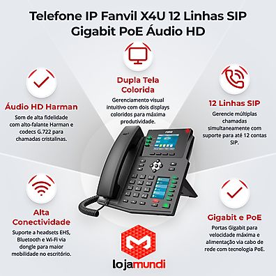 O Telefone IP X4U Fanvil destaca-se por suas funcionalidades avançadas, incluindo uma tela de alta resolução e um sistema de áudio HD que garante clareza nas chamadas. Ele suporta até 12 contas SIP e oferece conectividade Gigabit Ethernet. A configuração intuitiva e o suporte a fones de ouvido também são diferenciais importantes, tornando-o ideal tanto para uso corporativo quanto para setups de escritório em casa.